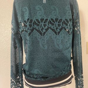 Mesh dark blue/ green long sleeve top with striped cuffs,