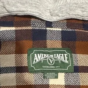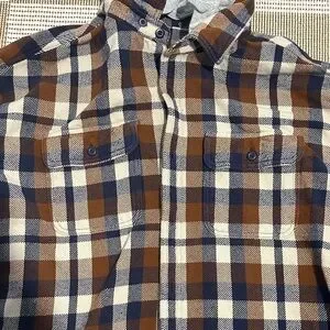 Plaid button-down shirt with hood. Features brown and blue plaid with gray hood. Ideal for casual wear. The hood is detachable via buttons. Only worn once. Size XL.