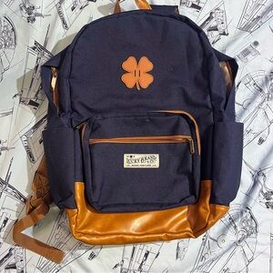 Faux leather accents on this canvas backpack by Lucky Brand. Features a nice lucky clover. Great looking item! Has some stain in a pocket - maybe a crayon/marker. I did a delicate wash so it’s clean but the pocket could possibly be treated further.