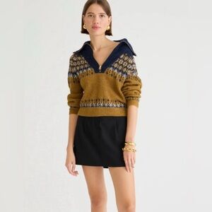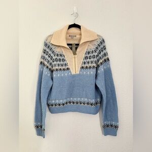 J. CREW Fair Isle Half Zip Alpaca Wool Blend Sweater Brushed Yarn Blue Large NEW