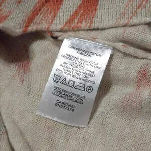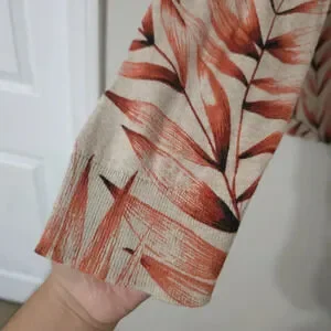Pre-loved but in good condition. Normal wear. No holes or tears found. Beautiful neutral light tan with Burnt Orange leaf pattern. Can be used in formal wear or casual everyday outfits. Cuff and hem habe a Ribbed Knit detail.