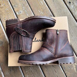 Brand new and never worn! British Tan Leather Clarks Aspra Side Zip Bootie in Women's 11 - The perfect accompaniment to cold-weather ensembles, ankle boot Aspra Buckle is the style to turn to when taking on city streets and cobbled lanes alike. Grounded atop a grippy rubber outsole that keeps you steady on frosty ground, this zip-up silhouette is finished with an eye-catching buckle detail that lends polish to every look. It’s designed with comfort in mind, too, and makes use of a cushioning foam footbed that supports every step.