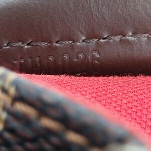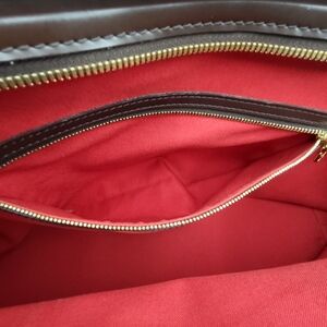 Elegant red fabric interior with brown leather trim. Features gold zipper detail. Iconic Louis Vuitton branding.