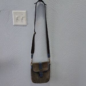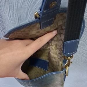 Sophisticated Coach crossbody bag in tan and blue. Ideal for everyday use.