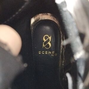 Elevate your style with Scene Weaver's ankle booties, showcasing a chic black and gold design. These boots feature a layered fringe detail that adds dynamic movement, complemented by a high heel and rounded toe for a sophisticated look. Perfect for adding a touch of flair to any ensemble, these booties are a versatile wardrobe staple. look like there new never been walked in but the inside is pealing a little.