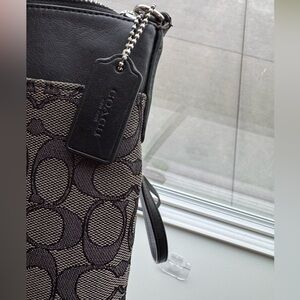 Stylish Coach crossbody with iconic pattern. Perfect for everyday use. The image shows a COACH Kitt Messenger Crossbody Bag in black and gray signature jacquard.