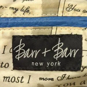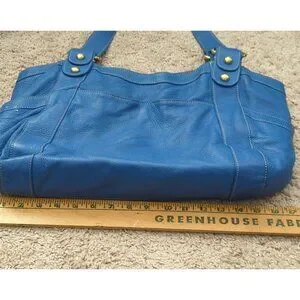 The Barr+Barr Women's Bag is a stylish hobo bag made of blue leather with a solid pattern. It features double handles in the same blue color, a magnetic closure, and gold hardware. The interior is lined with a multicolor fabric and includes inner pockets for organization. Includes pockets for credit cards. Magnetic closure. This medium-sized purse is perfect for everyday use and adds a touch of sophistication to any outfit. There a few minor spots (see pictures), all else in very good condition.