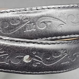 Elevate your style with this sleek black leather belt featuring a sophisticated silver buckle. Perfect for any occasion.