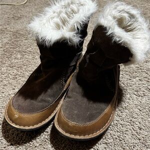 Material: The upper is typically a combination of suede and leather, with a faux fur or Sherpa lining.