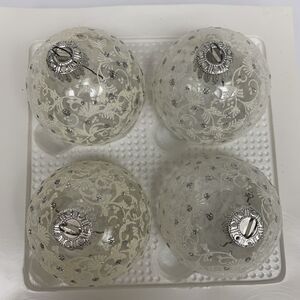 The Vintage Christmas by Krebs Hand Decorated 3" Glass Ornaments are a set of four beautifully crafted decorations perfect for Christmas. Made with intricate floral patterns and a Victorian style design, these round ornaments feature a clear, white, and silver color scheme.
