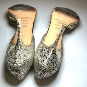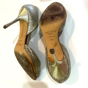 Jimmy Choo heels with shimmering silver & leather. Perfect for adding glamour to any outfit.