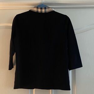 Elegant black blouse featuring a classic checkered collar. Perfect for any occasion.