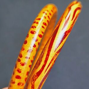 Set of 2 vintage acrylic bangle bracelets. One with leopard and one with a tiger/zebra pattern. Orangish-brown with dark brown/blackish animal print design. Great vintage condition. 8"