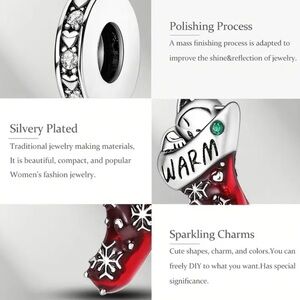 Pandora 925 Sterling Silver Christmas Stocking charm pendant with '”Warm” engraved on side one and “Home” engraved on side two with red accents. Perfect for bracelets or necklaces.