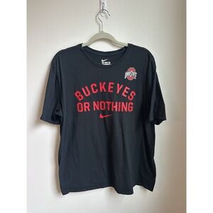 The Nike Ohio State Buckeyes Shirt is an officially licensed football shirt designed for men in size XL. The shirt is in black color, representing the Ohio State Buckeyes team. This shirt is perfect for fans to wear during the regular football season, displaying their team pride and support. Made by Nike, a trusted brand in sports apparel, this shirt is a stylish and comfortable way for fans to show their allegiance to the Ohio State Buckeyes.