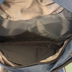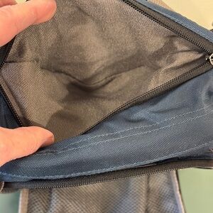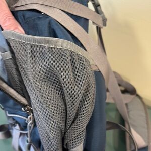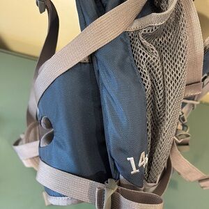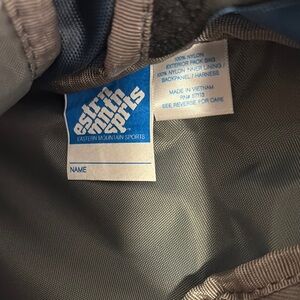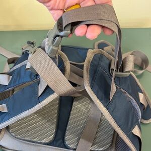 EMS blue & gray nylon waist/fanny pack with removable shoulder strap. Two Mesh side pockets for water. Two zipper close compartments + zippered smaller pouch. Measurements are 13” wide x 12” tall. Like new condition.