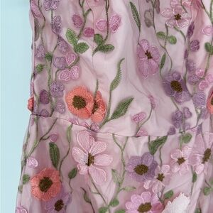 Charming pink midi dress with floral details. Halter neckline. Ideal for elegant events.