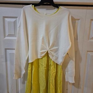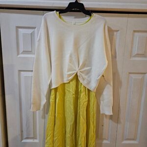 Stylish midi dress with a cream top and yellow skirt. Perfect for casual outings.