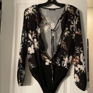 Boohoo Women’s Body Suit Size 10=L Floral Black Background Ties Round Neckline