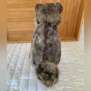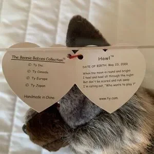 Howl was born on May 23, 2000, is a wolf with hard marble red and black eyes and a black nose. He has gray mottled soft fur on top and faux fur on his underside and at bushy tail. He has dark brown legs and feet.