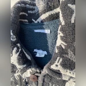 Funky knit animal print designed jacket that is ready for a new home. Perfect for the fall days ahead with tons of life yet to be lived. Fully lined, and cozy warm! Unfortunately the brand tag has been removed, I believe the brand to be Bravo as I have seen some others online listed under that brand. In good used condition with plenty of life yet to be lived. No apparent holes, rips or stains noticeable. Button front closure. Made in Nepal