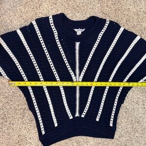 Elevate your wardrobe with this chic navy and white striped sweater. Perfect for layering and adding a touch of style to any outfit.