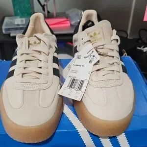 Classic Adidas Samba sneakers in cream with black stripes. Gum sole for a retro look. 9 Women's, new in box. Box is damaged. Comes with black laces as well.