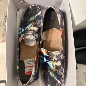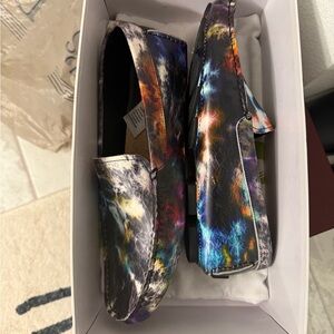 Vibrant loafers with a galaxy print. Features a mix of colors for a bold look.