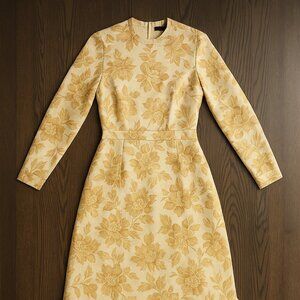 This is a stunning golden and brown floral haute couture inspired evening dress that radiates elegance and understated luxury.