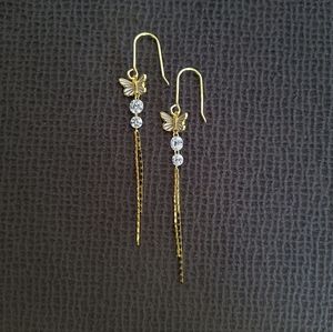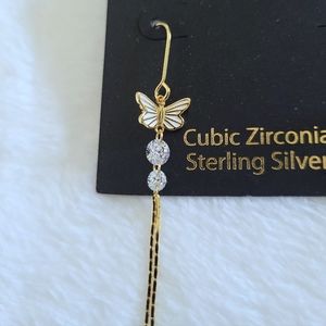 Two✌️ cubic zirconias💎 with two✌️ strands of gold💛 chain⛓️ dangle from a dainty white enamel butterfly🦋