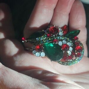 Floral statement brooch with rhinestones in colors of opalite, Ruby and emerald green.