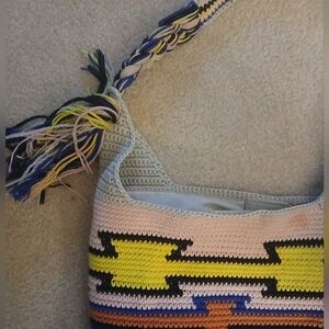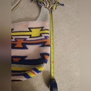 This colorful and stylish limited edition hobo bag from The Sak is perfect for any occasion. The exterior features a colorful pattern with crochet accents. The bag has a magnetic closure and a crossbody/shoulder handle made from crochet material with tassles.