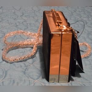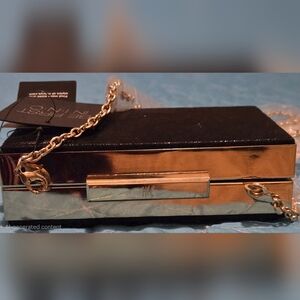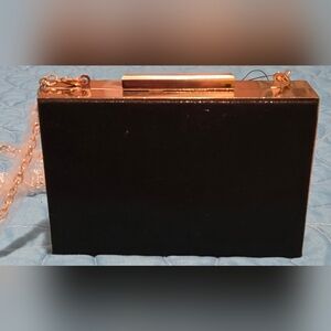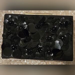 Elegant black clutch adorned with a 3D floral & sequin front with embellishments. The back is a shiney solid black and vegan leather. The clutch is surrounded in a gold tone, snap top, with a removable gold chain. Perfect for evening events and special occasions. This is a beautiful little clutch that will fit your necessities.