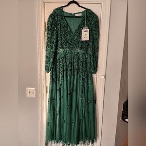 This stunning green evening gown features intricate detailing and a flattering silhouette, perfect for any formal occasion.