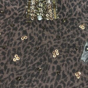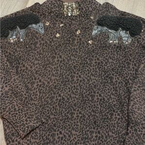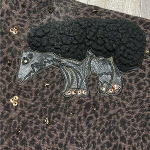Rare 80s novelty sweater with a bold leopard knit and two stylized hedgehog appliqués. Features real leather patches, textured wool “spines,” sequins, rhinestones, and beadwork across the chest. A highly collectible Hong Kong angora-era statement piece.