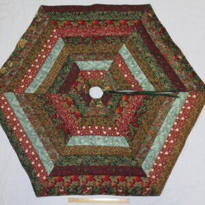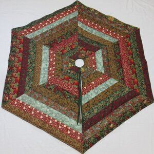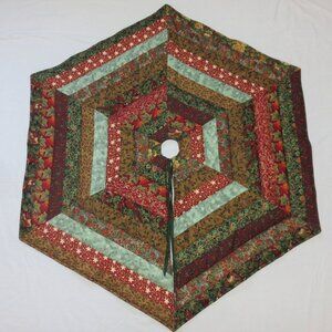 Handmade in the USA Christmas Tree Skirt in a traditional and timeless patchwork design. Six sides with slightly pointed edges and one fully open side to easily slip around your holiday tree. Shades of deep gold, green and muted rust red with minimal metallic accents blend with any holiday theme. Measures 47.5“ diameter point to point / 41“ across at flat edges. Center opening is 3“ and skirt has 16” fabric ties to further adjust size and to hold tree skirt in place. Pieced using traditional techniques and quilted using a standard sewing machine. Finish method is sewn and turned with straight topstitching along all edges. Quilted in green thread in a festive scrolling tinsel-like or garland design. Top and backing are cotton fabrics with high loft batting inside for an extra puffy and softly draped skirt for your treasured packages and gifts. The backing is mottled dark green and black and can be used as the top side for a different look. Excellent for traditional, rustic, farmhouse, cottagecore, and nostalgic holiday themes.