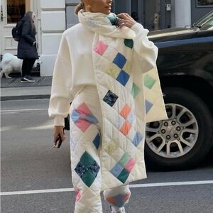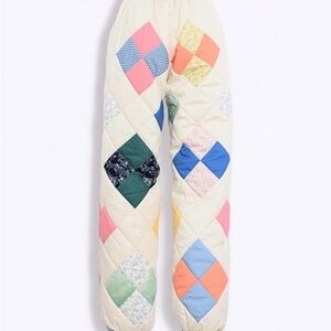 Vibrant patchwork quilted pants. Features a mix of colorful diamond patterns on a white base.