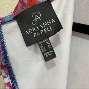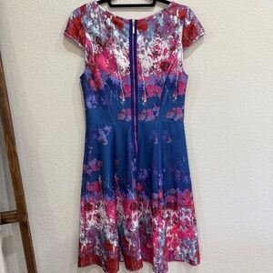 Elegant dress with vibrant floral patterns. Features a mix of red, pink, and blue hues.