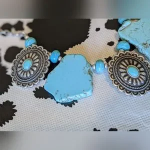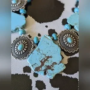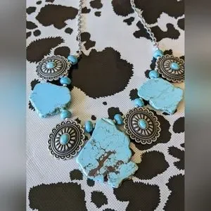 Elevate your style with this stunning turquoise and silver statement necklace. Perfect for adding a pop of color to any outfit.