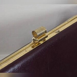 This lovely vintage clutch measures 5" x 10-1/4" (at its widest). I'd describe the color as burgundy or wine. It's lined with brown vinyl. There is a light scratch on the back below the clasp, and a small white scuff (see photos), and there are a few spots on the metal frame, but it's in beautiful condition otherwise. Comes from a smoke-free home.