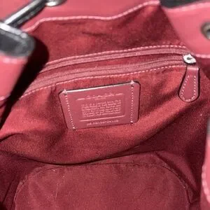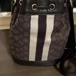 Elegant Coach bucket bag with signature pattern. Features leather accents and drawstring closure. Full size, not mini. About 10” tall, 9” wide, 5” across bottom. Comes with removable adjustable fabric crossbody strap. Leather is in great shape, normal wear to fabric as shown. No holes or tears. Very good condition.