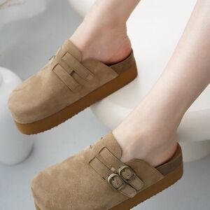 Elevate your style with these elegant beige suede platform shoes. Featuring a chic double buckle design, they offer both comfort and sophistication.