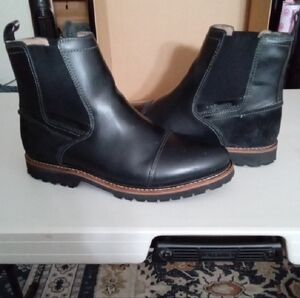 Experience timeless elegance with these G.H. Bass & Co. Chelsea boots, featuring a sleek black leather upper and a contrasting brown sole. The elastic side panels and pull tabs ensure easy wear, while the polished finish adds a touch of sophistication to any outfit.