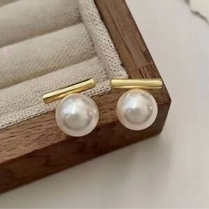 Anthropologie Petite Bianco Pearl Gold Bar Earrings