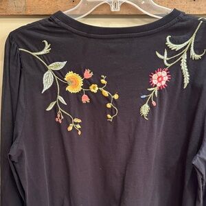 Chic black blouse featuring colorful floral embroidery. Ideal for a stylish look.