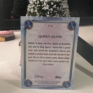 Elsa character card from Disney. Features elegant blue accents. Perfect for collectors. Queen Iduna included