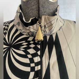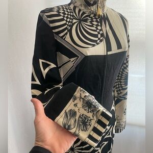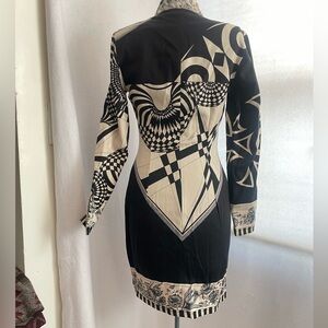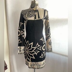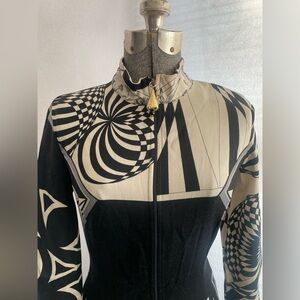 This vintage dress from Versace’s diffusion line Versus is so fun! Fabulous black and cream mod/psychedelic print with floral details. Wool blend. Zip front. A couple callouts: the zipper pull needs to be replaced and fhere are two areas of discoloration on the back of the left arm; priced to reflect the rarity of this dress balanced with these callouts. V minor amount of stretch. See photos for all the stunning details and for flat sizing.