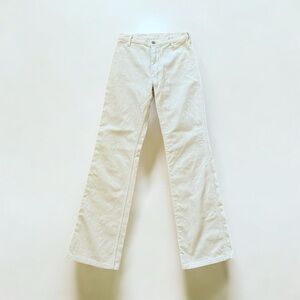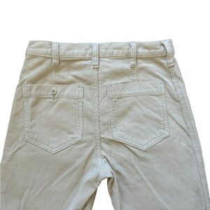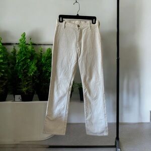 Cream corduroy straight leg pants with a slight flair. Very soft, flattering high rise fit. Zip fly, flat front with no front pockets. Two back pockets. Perfect condition, like new. Worn only once. 27” waist, 31” inseam.