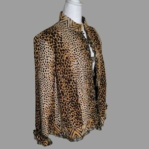 The Frenz By Theresa Renz Women Blazer in size 2X features a stylish animal print design with 3/4 sleeves, perfect for adding a touch of gothic chic to any outfit. Made from cotton with a polyester lining, this hip-length blazer is suitable for various occasions including travel, parties, casual wear, and workwear. The ruffle accents and open front add a trendy and lightweight feel to the piece, making it a versatile and fashionable choice for the winter, fall, and spring seasons.