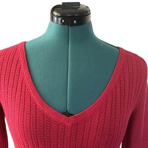 Reddish color V-Neck sweater. Sweater has a pretty cable type pattern in the front, back and arms are ribbed. Sizes are in pictures.